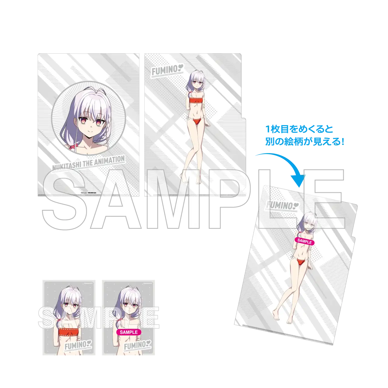 【価格】 1,760円(税込) 【仕様】 全1種 サイズ:クリアファイル…A4 ブロマイド…L判 材質:クリアファイル…PP ブロマイド…紙 【商品説明】 「ぬきたし THE ANIMATION」からイベントビジュアルを使用しためくれるクリアファイル&ブロマイドセットが登場です。1枚めくると別の絵柄を見ることができるクリアファイルと、ブロマイドが2枚セットになった商品です。
